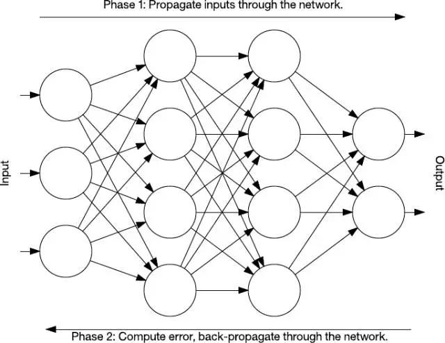 反向传播是一种用于训练多层神经网络的算法。它的工作过程分为两个阶段。第一阶段是将输入传播通过整个神经网络直到最后一层(称为前馈)。第二阶段,该算法会计算一个误差,然后从最后一层到第一层反向传播该误差(调整权重)。