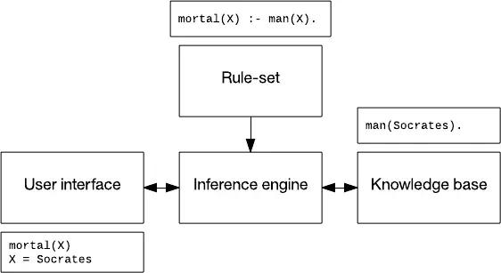 基于规则的系统通常由一个规则集合、一个知识库、一个推理引擎(使用前向或反向规则链)和一个用户接口组成。下图中,我使用了知识「苏格拉底是人」、规则「如果是人,就会死」以及一个交互「谁会死?」