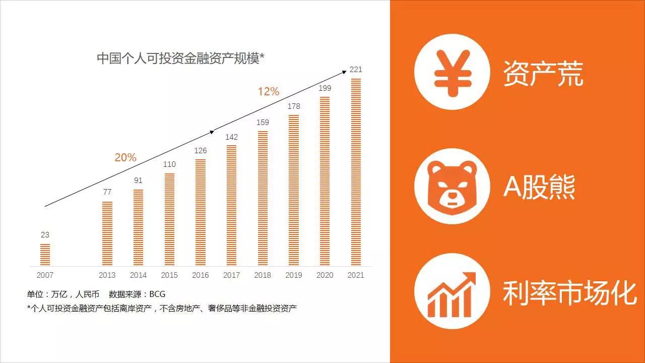根据BCG数据,中国个人可投资金融资产规模2016年达到126万亿。回溯2007-2016这十年,个人可投资产规模复合增速超过20%,是绝对的黄金时代。但看未来十年,复合增速将下降到12%,因此我们定义为白银时代。