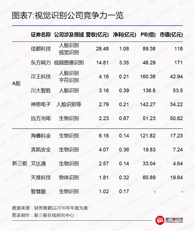 我国A股中处于视觉识别领域的公司主要分布在生物识别领域,个别细分专注于人脸识别。新三板视觉识别厂商企业中,营收和净利规模能与A股上市企业对比的有海鑫科金、奔凯安全、文达通,而3家企业市值均未过20亿元,与A股营收相似规模的企业有着显著的估值差。