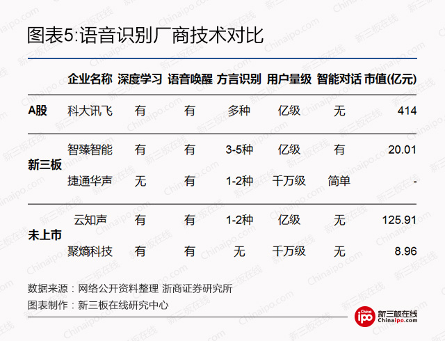 目前,科大讯飞、百度是我国智能语音的龙头,新三板企业智臻智能、捷通华声和创业公司云知声、聚熵科技为排名靠前的公司。对比语音识别知名厂商市值来看,在亿级的用户量级中,新三板企业智臻智能市值较低,潜力正待爆发,而科大讯飞、云知声均已获多轮融资,市值暴涨。