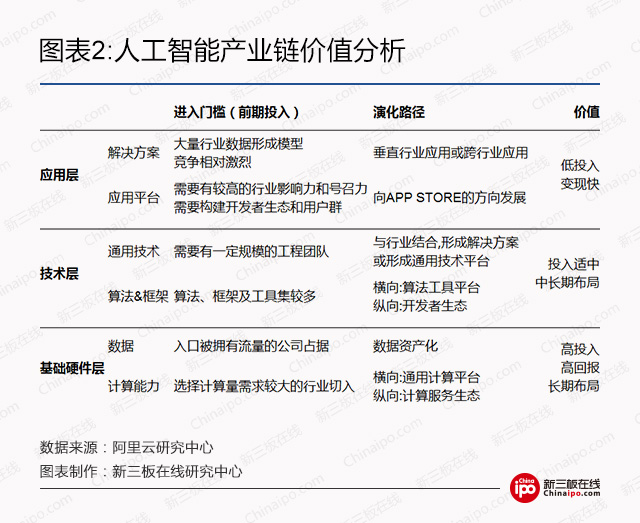 人工智能产业链分为基础硬件层、技术层和应用层。