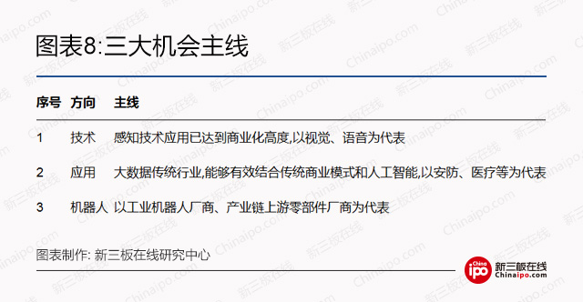 人工智能相关技术正在不断获得突破,产业链正在不断得到完善,市场的持续增长也给予了投资者各种布局的机会。新三板在线总结了技术、应用、机器人三个方面的机会主线: