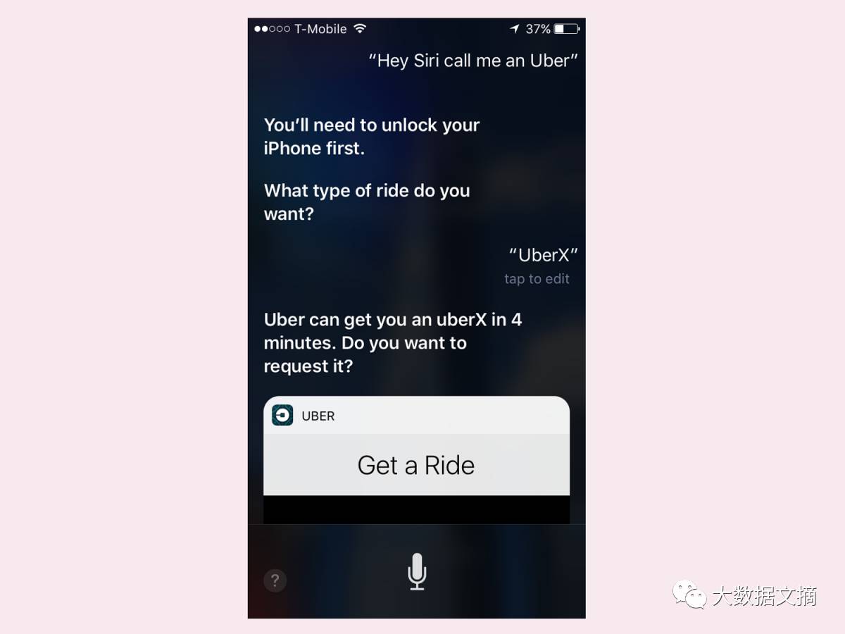 Siri在这个题目上表现最好。如果你授权了Uber,它就会问你想要哪一个车辆类型(UberX,UberBlack等等),然后给出一个Apple地图的小窗为你展示最近的车辆、预计到达时间和费用估计。在确认订车细节之后,它就帮我订到了一辆Uber。这差不多就是我想要让它做的。
