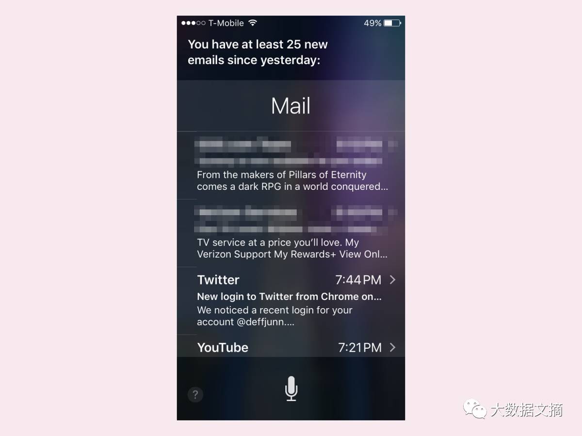 Siri在这个任务上做的最好。它告诉了我从昨天开始一共有多少封未读邮件,并且在一个建议的邮件小窗口中显示了这些邮件。