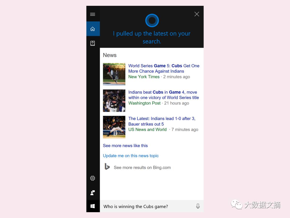 Siri,Google Assistant和Alexa都自信的给出了当前比分。而Cortana则给出了一条关于Cubs球队文章的链接。