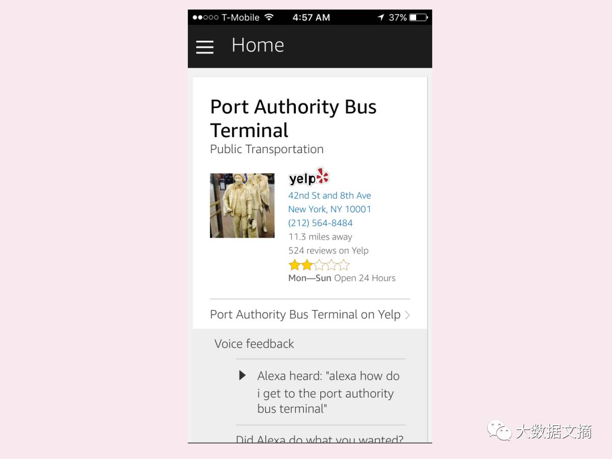 相比之下,以蓝牙音箱为载体的Alexa就明显弱多了。它确实用了Yelp的数据找到了正确的地点,告诉了我地址和时间表,但它没有打开任何的地图软件。