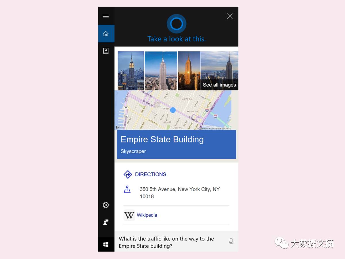 Cortana只是打开了一个写满了帝国大厦信息的小窗口,我需要点击“路线”这个按钮才能得到我想要的信息。