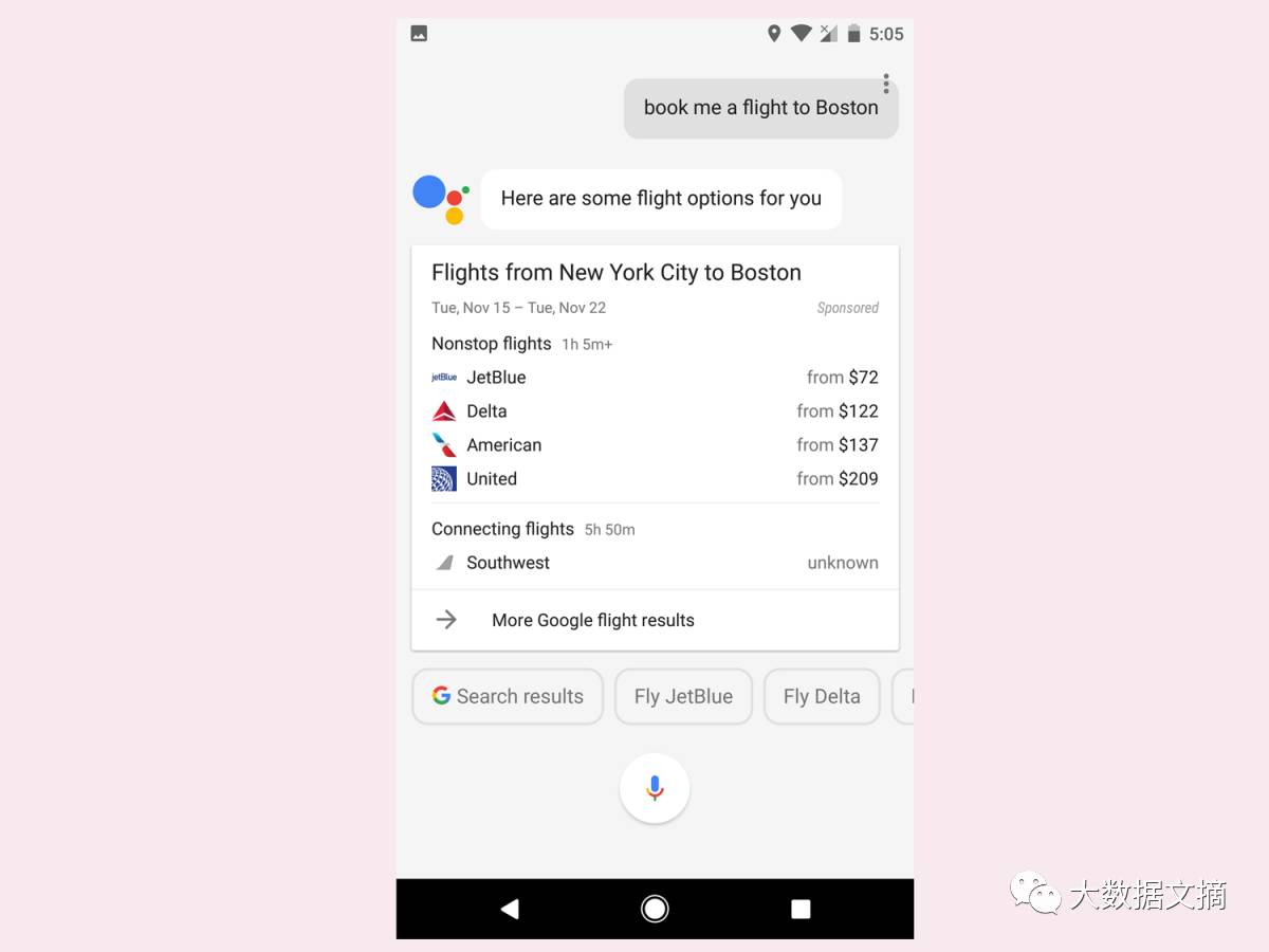 这道题目所有的助手成绩都不理想。相比之下,Google Assistant依旧是做的最好的,它为我展示了各个航班的路线及机票价格。我可以点击其中的某一个来预定路线,但奇怪的是根据默认设置它只给出了两周之后的航班信息。如果我选择了“下一个航班”之后,它则会为我显示更近的搜索结果,不过你也不能太把它当回事了。但当我说,“我要第一个航班”是,它就懵逼了。即便如此,Google还是比其他几个要好多了。
