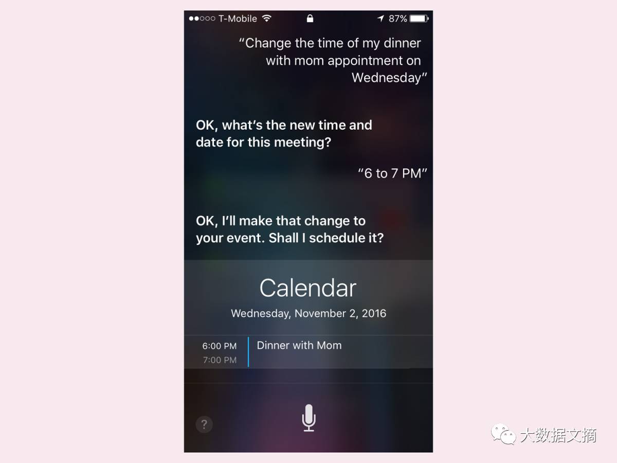Sir轻松完成了这个任务。它从我的联系人列表中识别出了“妈妈”,询问我想要什么时候开始晚餐,并且能够让我方便的确认、更改并取消这个任务。不过同样的,它默认让你使用Apple的软件——没有Calendar这个软件的话,你几乎什么也做不了。