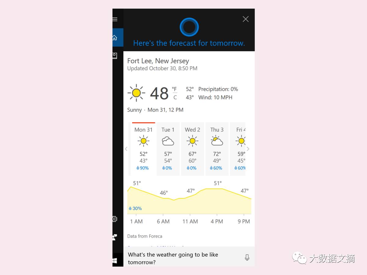 除了Cortana的其他助手都明白了我的问题。Cortana啥都没说,就只是给出了一个带有天气信息的图表。