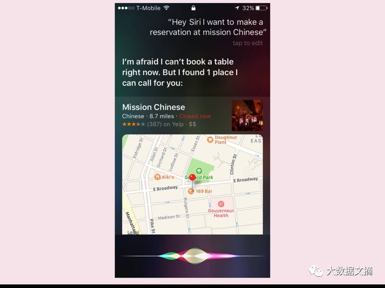 同上,只有Siri可以做到这一点,这得益于它与OpenTable(一个餐馆订餐的app)的合作。 在上面的例子中,它找到了我附近最近的餐厅,还能标注餐馆已经打烊了所以我无法预订。 如果我需要的话,Siri还可以帮我给这个餐厅打电话。