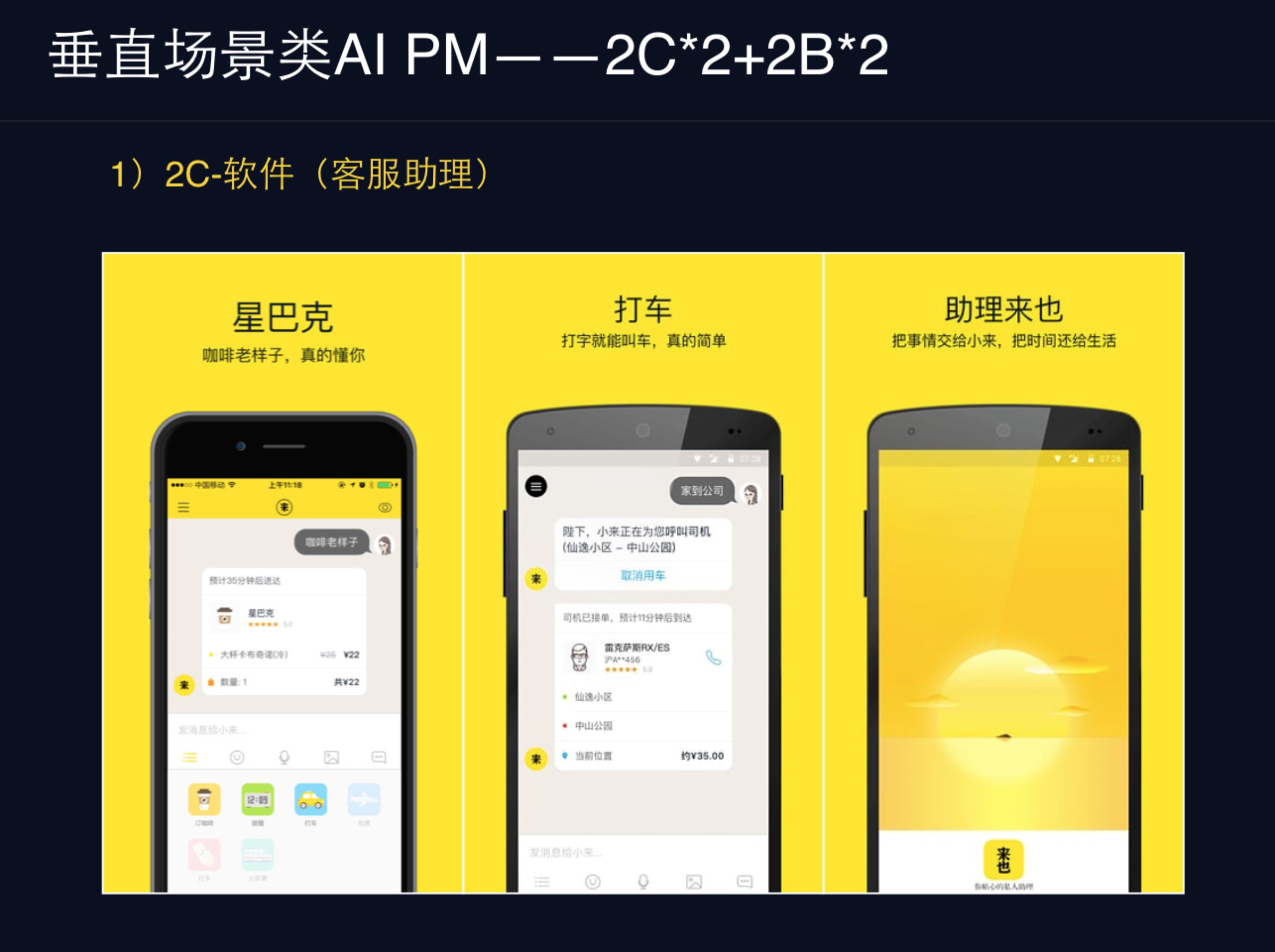 比如上图显示的“助力来也”,她是一个AI+人工的客服助理,可以帮用户定咖啡、打车等等。其AI PM需要设计的是,在垂直场景下,怎么通过AI让用户更好的使用各种服务。