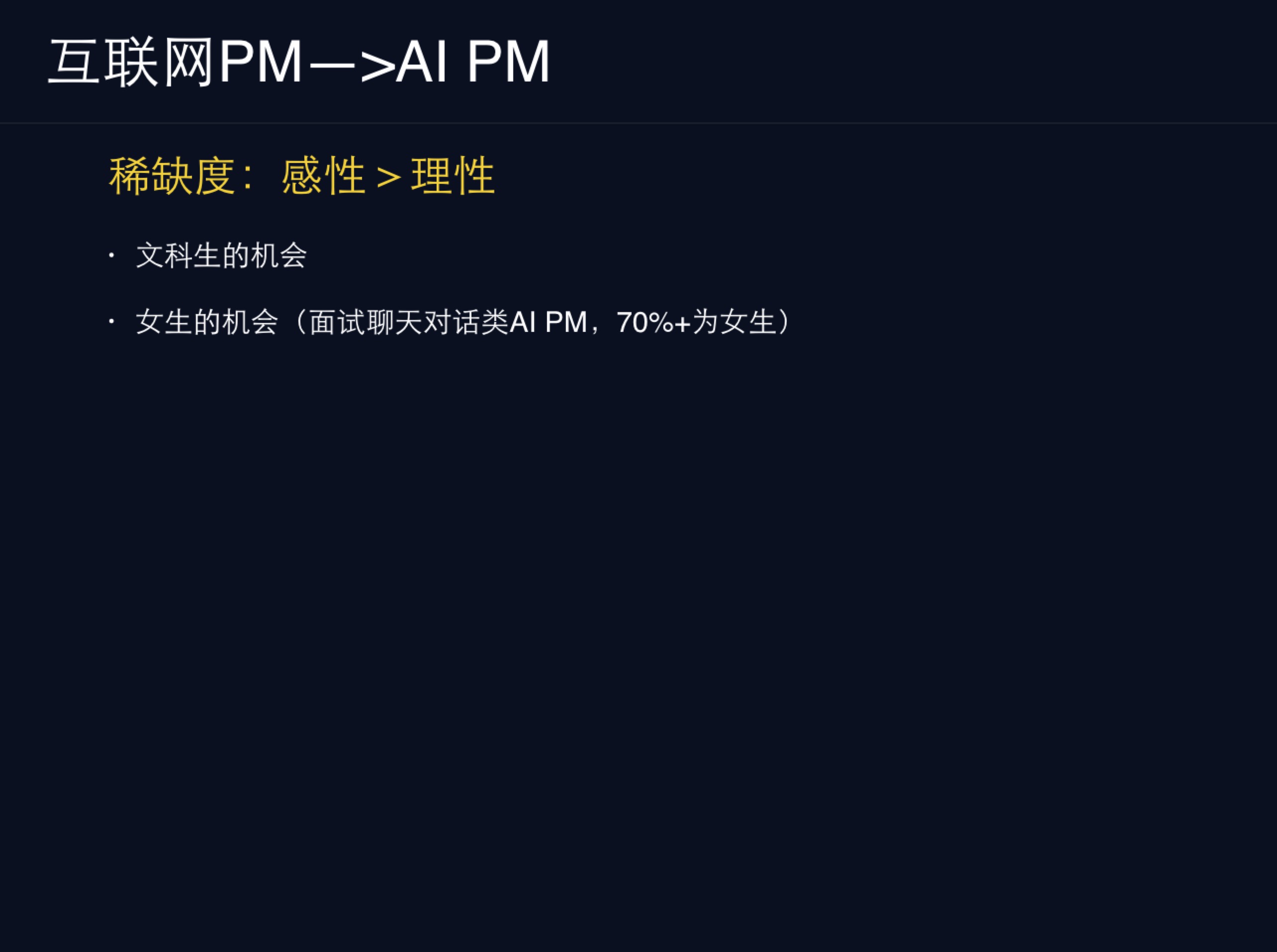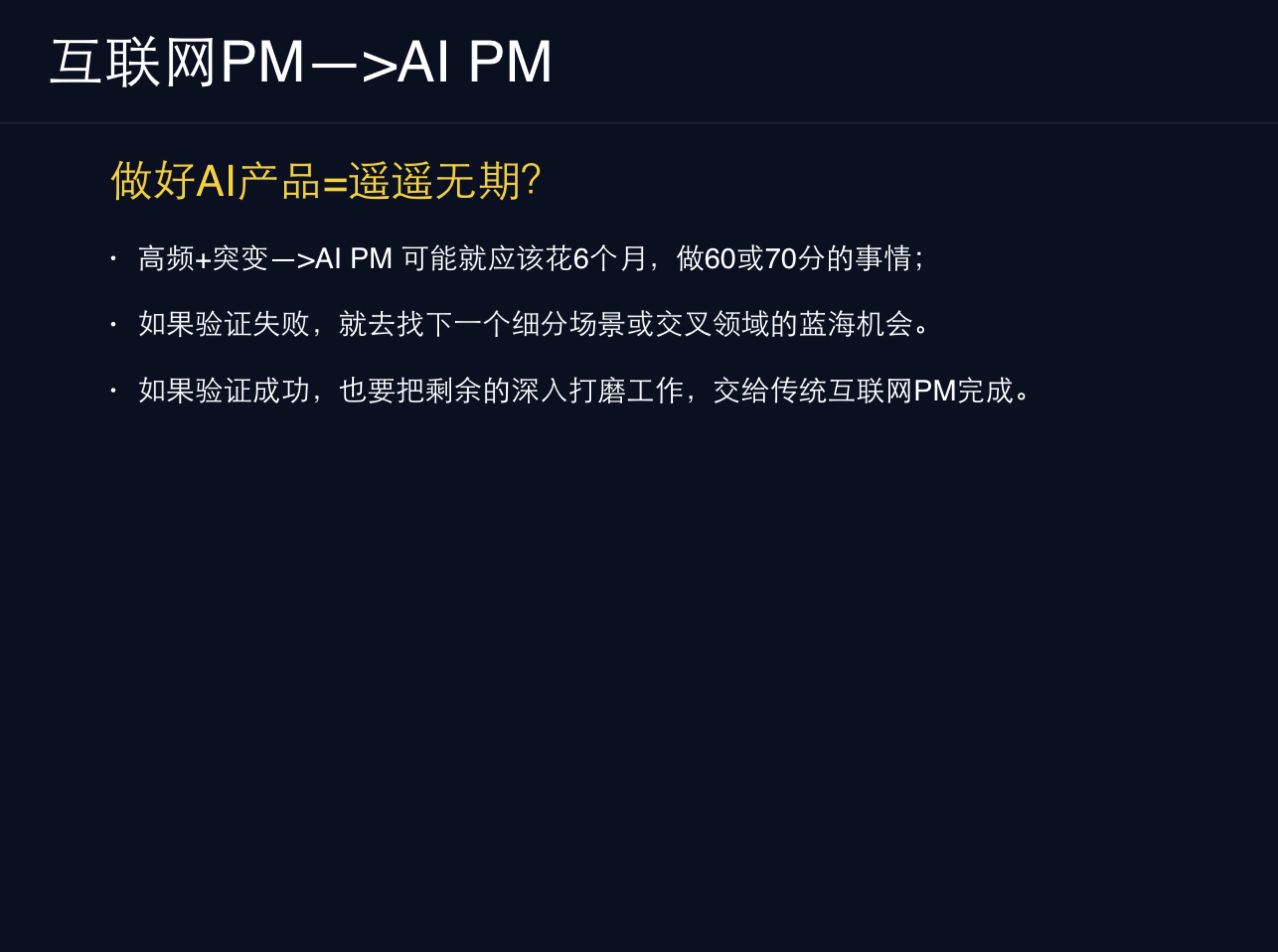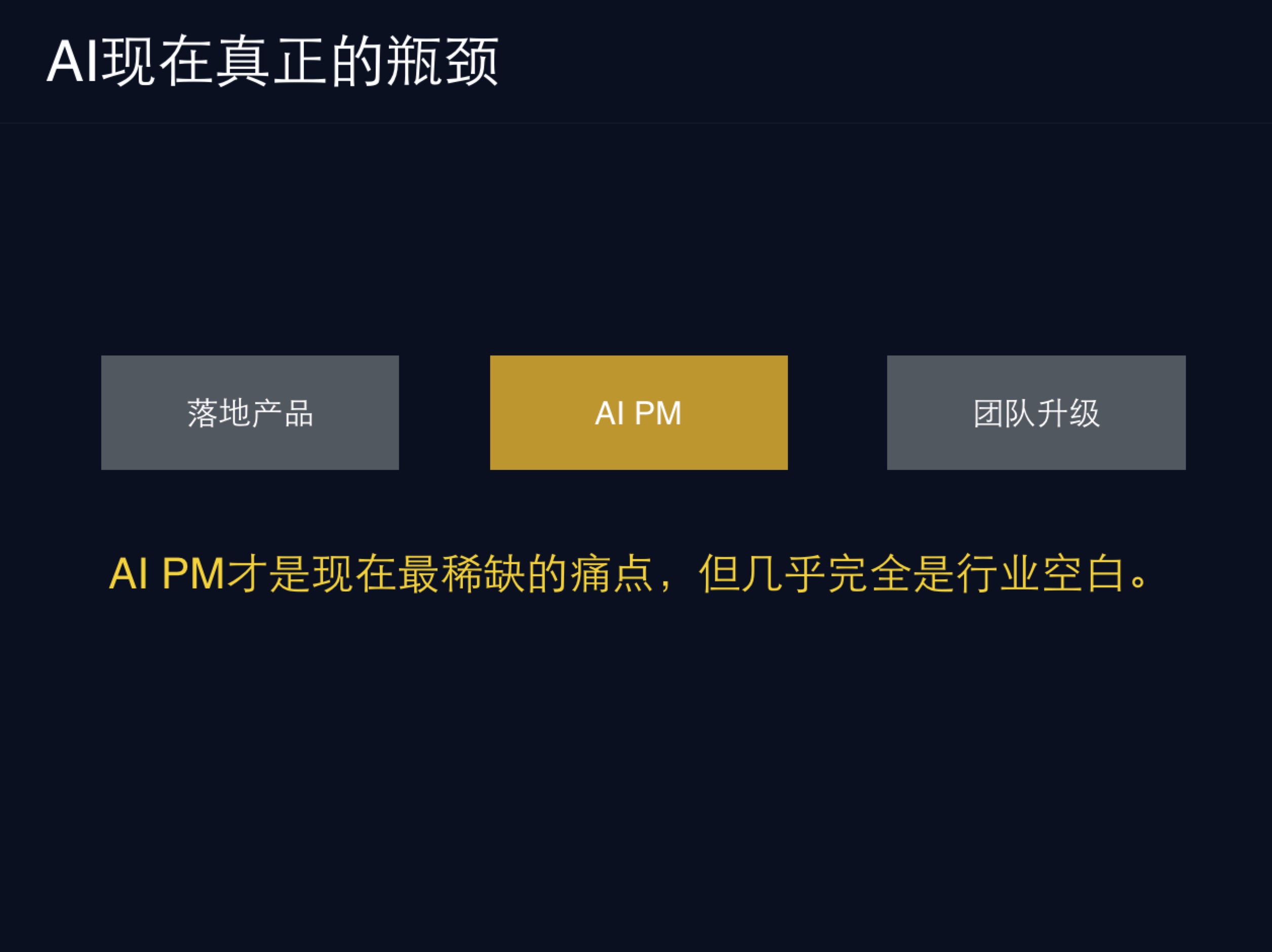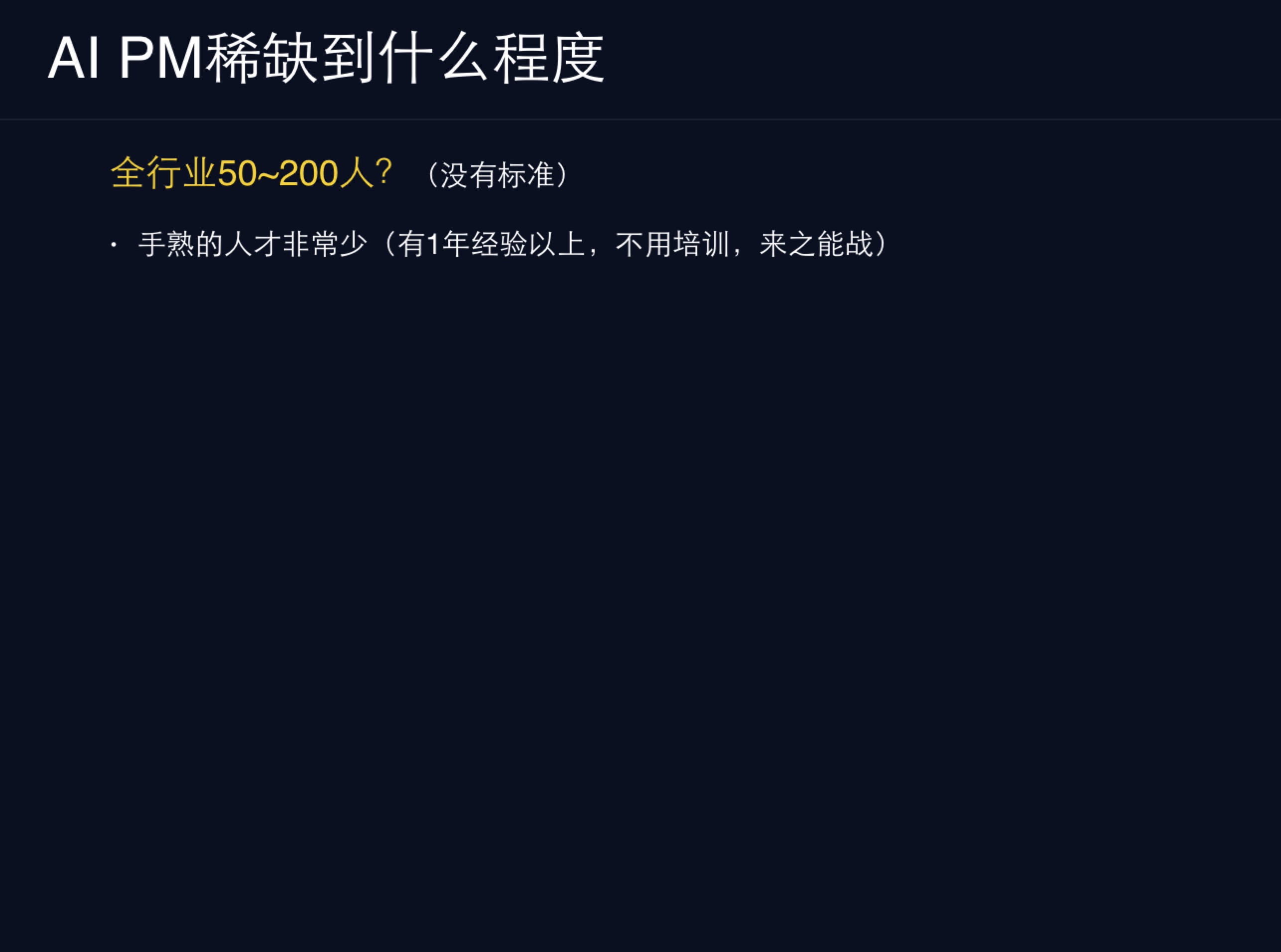 互联网时代,一个公司可能只有1~2个方向,但AI时代,因为会出现非常多的细分场景和交叉领域,所以一个公司可能会有多个产品方向要探索,这时,CEO个体的知识储备和精力已经顾不过来了,需要各个AI PM帮他在单个方向上独当一面。