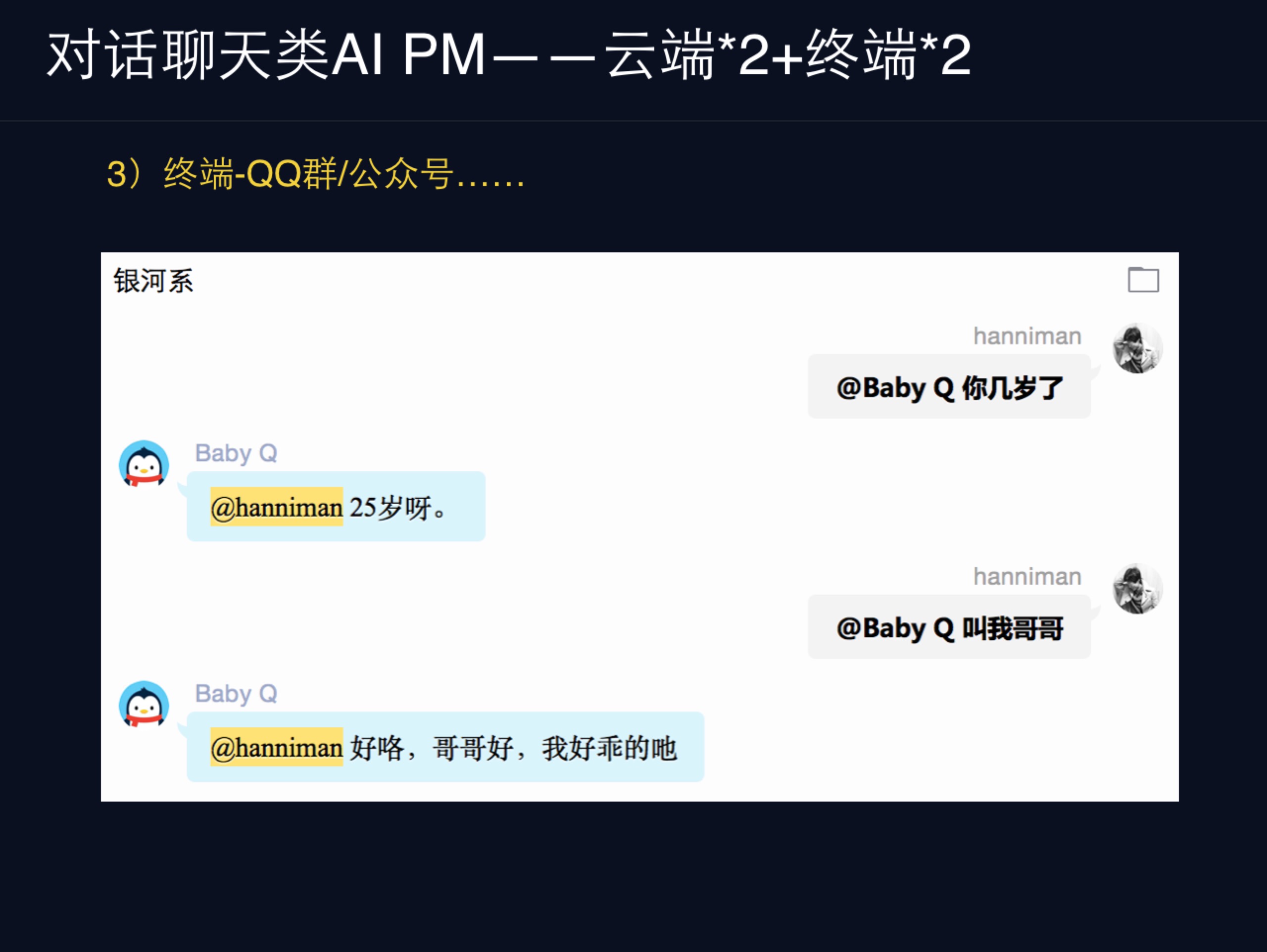 图中示例,是图灵机器人和QQ群官方正式合作,在QQ群里面接入了图灵的聊天机器人Baby Q,用户@她,就会自动聊天回复,以此活跃QQ群的氛围。(注:需要群管理员在“管理群-设置群机器人”里开启此功能)