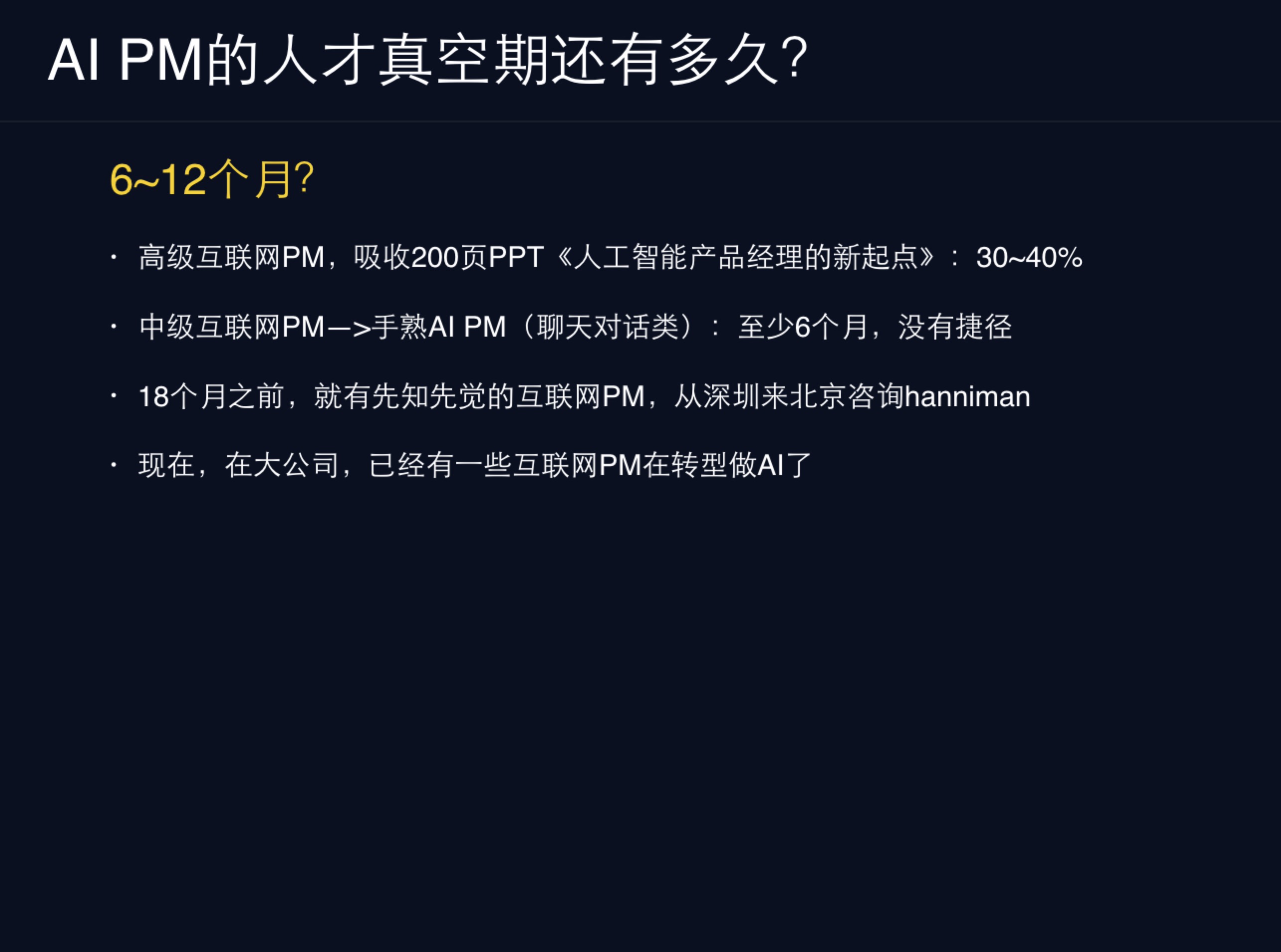 所以,综合现阶段的稀缺度和可行性,AI PM才是目前行业最稀缺的痛点,而且是行业空白——现在不仅没有AI PM的分类、能力模型、如何转型等体系化梳理,甚至AI PM这个概念,都是最近才刚刚在行业内被提到和普及的。