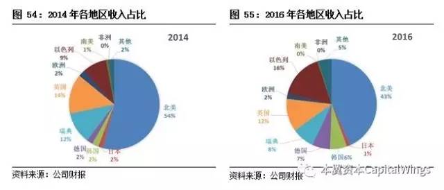 从地域结构来看,Mobile eye的营业收入主要来自于美国、英国、以色列和日本,但近几年来,公司来自于美国的收入份额逐渐缩小,在以色列和其他区域的份额逐渐扩大。2016年公司来自于北美、韩国、德国、瑞典、英国、以色列的收入占比分别为:43%、6%、7%、8%、12%和16%。