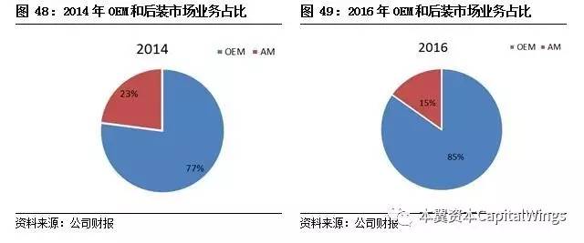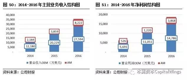 2016年公司实现营业总收入3.58亿美元,其中OEM业务贡献2.76亿元,占比85%;AM业务贡献8222.4万元,占比15%。2016年实现营业利润1.87亿元,OEM业务贡献1.48亿元,占比79%;AM业务贡献3868万元,占比21%。