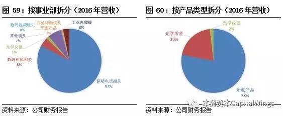 若按事业部划分,2016年三大主营业务:光电产品、光学零件、光学仪器对总营收的贡献率分别为:78%、20.2%和1.8%;如果按产品应用的类型进行分类,移动电话相关、数码相机相关、光学仪器、其他镜头、数码视频镜头占比主营业务收入分别为:83%、5%、1%、7%、1%。