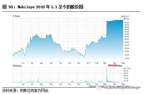 2017年3月13日英特尔以63.54美元/股,收购Mobileye,总额逾150亿美元,收购溢价达34.4%。由此,Mobileye的机器视觉算法与英特尔的芯片、数据中心、传感器融合,以及地图服务等方面将产生强大的协同效应,联手打造“软硬兼施”的全新无人驾驶供应商。最近一年的股价表现如下所示: