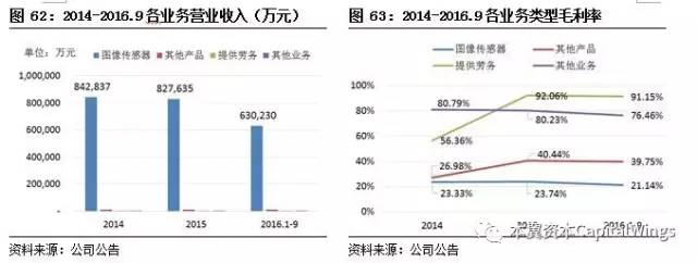 截止2015年末,公司共计实现营业总收入84.2亿元,按照业务类型进行划分,传感器收入82.7亿元,占比营业总收入98%,对比不同业务类型的毛利率可以看出,图像传感器的毛利率呈小幅下降的趋势,提供劳务的业务是盈利最好,毛利率高达91.5%。