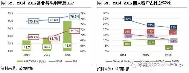 公司四大客户分比为:通用、日产、现代和宝马,其中宝马占比公司总份额逐渐下降,2016年四大客户对公司营业收入贡献的比例分别为22%、14%、11%和11%,合计占比58%。