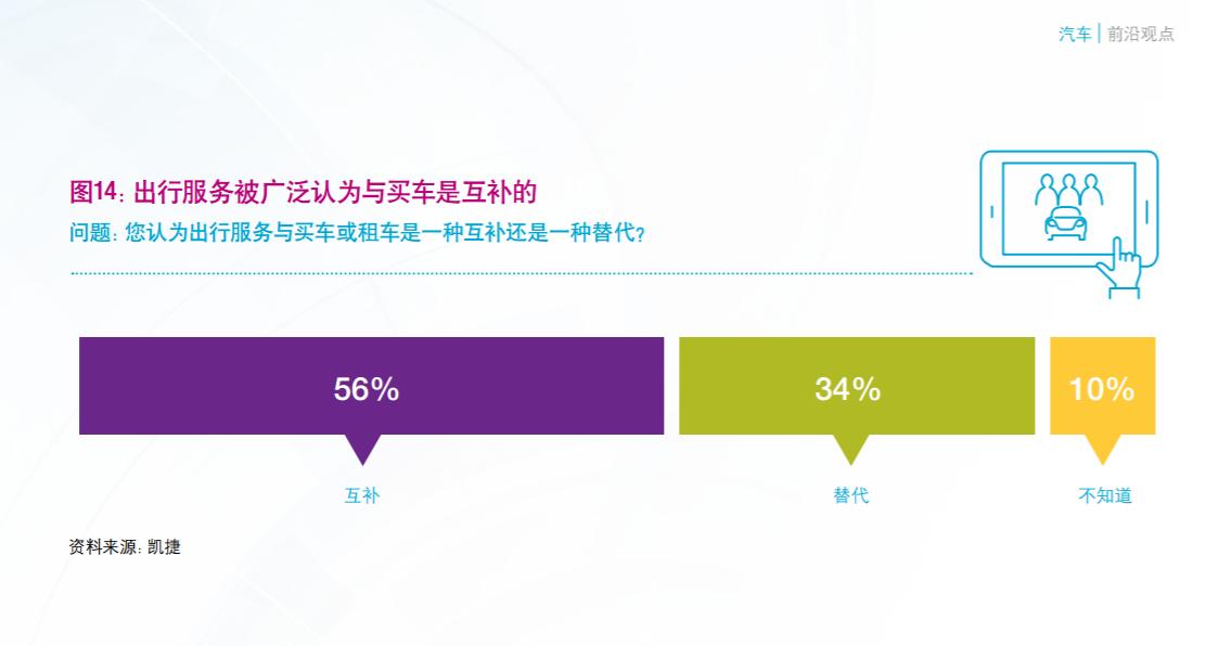 报告显示,截至目前,超过三分之一的购车者(34%)认为拼车和网约车服务确实可以替代养车。从调研数据来看,尽管新车销售保持显著的增长,但为了适应消费者观念的转变,一些大型汽车厂商正在通过自创、收购或合作等方式投资汽车共享服务,实现战略上的转变。
