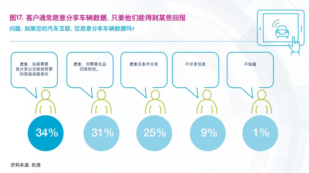 消费者对其他各种联网设备越来越熟悉,同时他们也在数据共享和获得个性化的优质服务之间进行权衡,因此,他们对互联汽车的态度正在发生改变。大部分消费者愿意上网共享他们的车辆数据(89%)和驾驶数据(76%)。而在2015年的调查中,只有80%的受访者表示会自愿或在一定条件下共享数据,这表明了消费者在数据共享方面的意愿一直较高。
