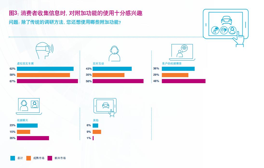 特斯拉和一些新兴创业造车公司如蔚来汽车等已经确认不会沿袭传统的经销商销售模式,其他大型汽车厂商的虚拟展厅发布活动等也引起了消费者的持续关注,消费者正在越来越多的通过非经销商及汽车厂商官网的渠道来获取新车信息,这些方式包括譬如 VR 车展(62%)、实时互动(43%)以及消费者视频博客(36%)。