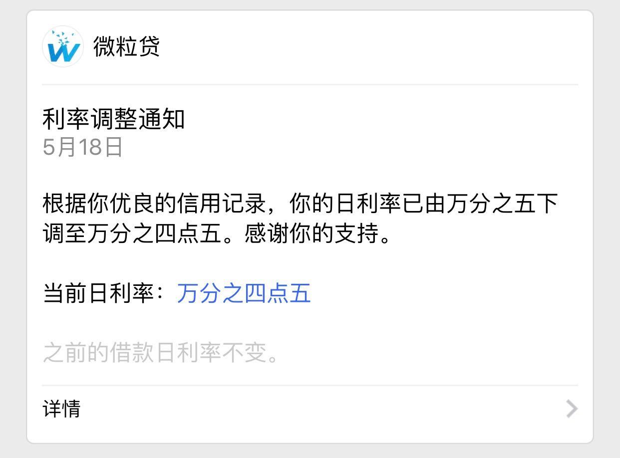 36氪作者就在近期收到通知,微粒贷的日利率从万分之五下调到万分之4.5,另一个用户则告诉36氪,他的微粒贷日利率也在近期发生变化,从万分之五,已经降低至万分之3.5。