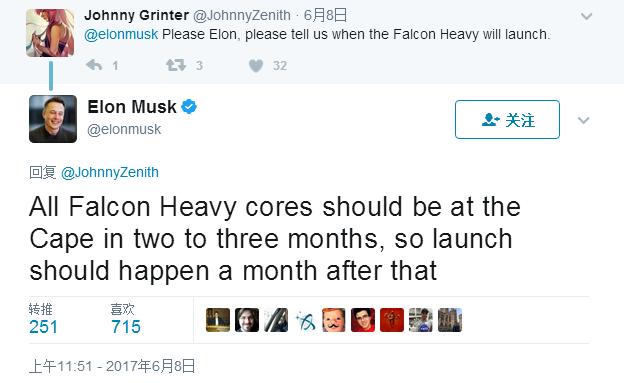 马斯克在Twitter上回答读者提问时表示,Falcon Heavy的所有核心部件会在2到3个月内运抵卡纳维拉尔角发射场,并将在此后1个月内发射升空。这意味着,Falcon Heavy的首次发射最早可能在9月初进行。
