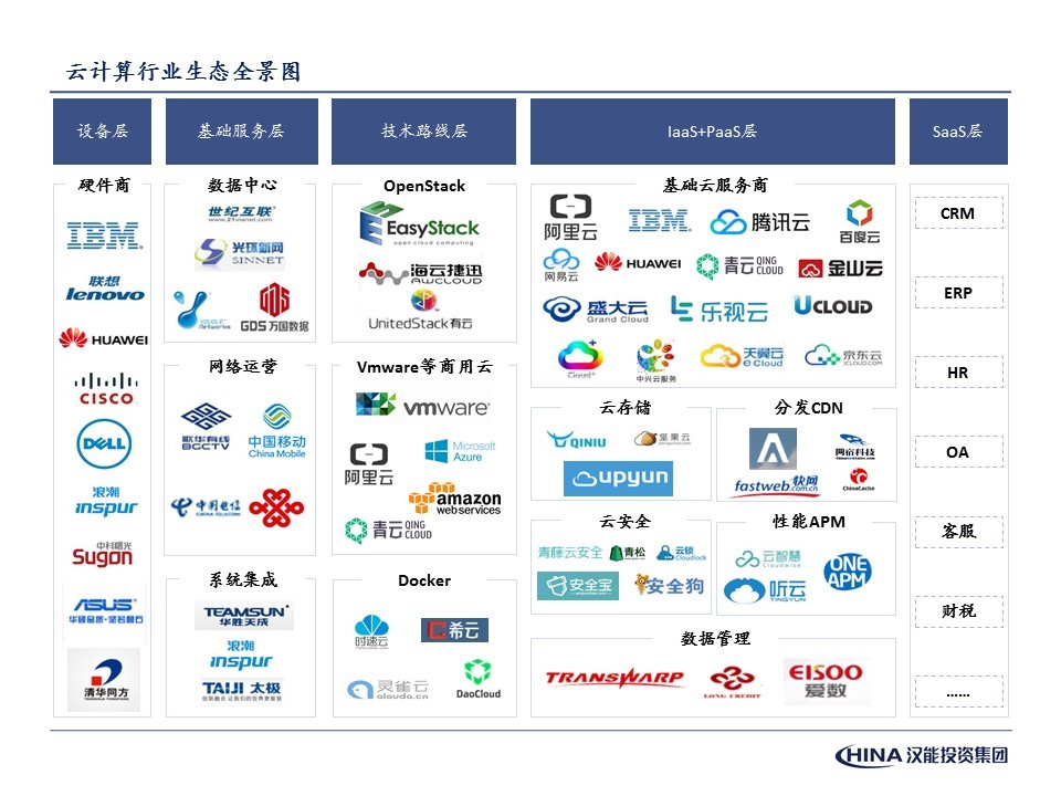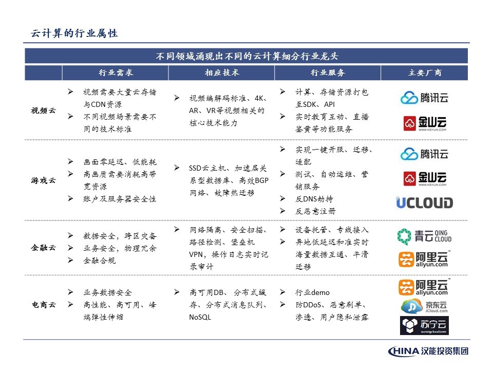 我们判断,未来随着客户的云计算相关需求进一步被释放出来,很难有一家公司能够做到在各个层次服务、各个行业领域、各个功能方向上都全面占据统领地位,IaaS和PaaS起家的服务商未必能将优势延伸至SaaS领域,领先的游戏云服务平台未必能顺利切入金融市场,云计算在各个维度上都将进行细分的专业分工。