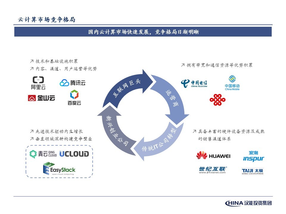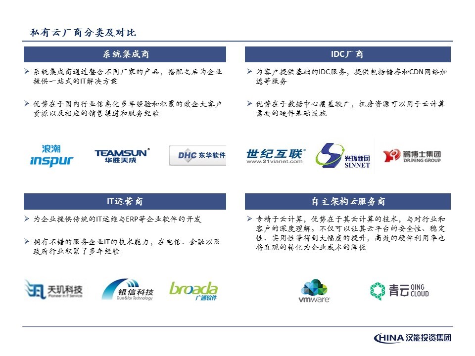 其中传统IT公司和电信运营商具备丰富的硬件设备资源、网络资源以及成熟的销售渠道体系,但在云计算核心技术方面的优势并不明显,此类公司通常会选择以私有云为切入。