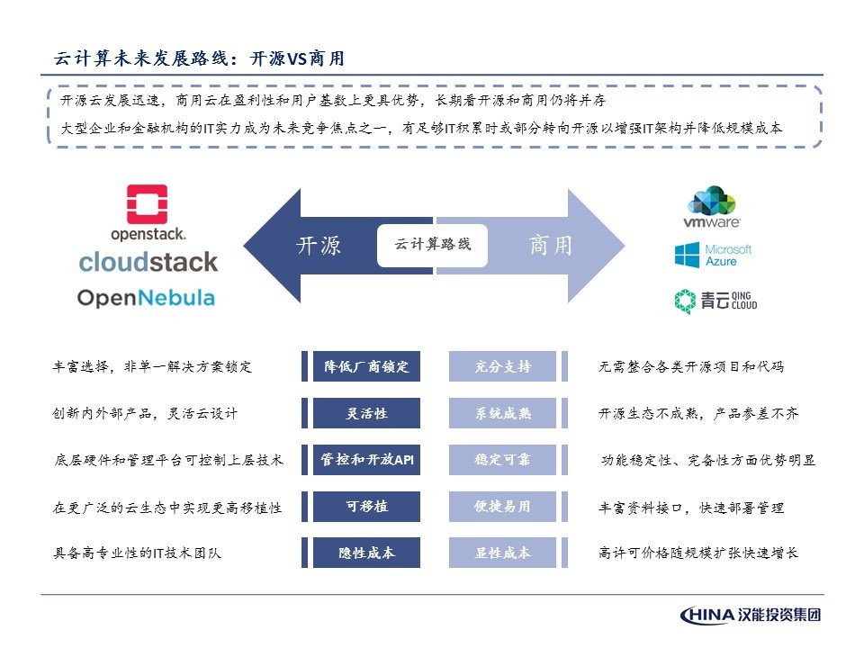 综上,我们认为开源云和商用云在未来将会长期并存。这是由于两种路线的云计算各有优势,两种路线的云服务商都将找到自己的客户群体。选择开源路线的客户通常拥有规模较为庞大的IT支持团队,希望采用灵活性更强的云服务;选择商用云的客户多数更为看重云服务的稳定性和可靠性,要求服务商提供更加全方位的技术和运维支持。