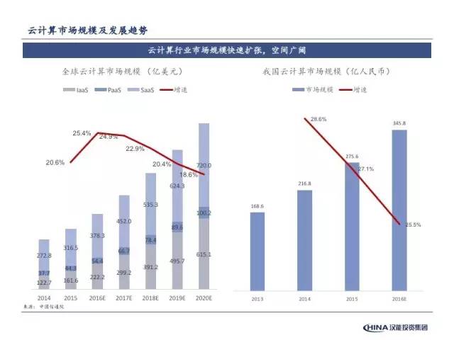 当前,全球云计算市场总体保持较为平稳的增长,2015年云服务市场规模超过500亿美元,行业增速达到20%,预计2020年将超过1400亿美元。在国内,云计算市场总体保持快速发展的态势,2015年我国云计算整体规模达到378亿元人民币,整体增速超30%。