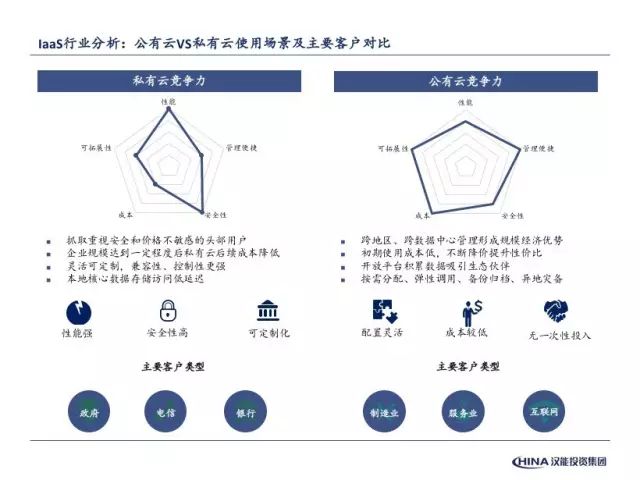 因此我们认为,由于上述供给和需求层面的种种差异,在中国本土市场上,更容易形成群雄割据的竞争局面,即使是创业公司也将拥有自己的立足之地。同时和国外市场以公有云为主导不同,私有云具备相对更大的发展空间。这是因为私有云是企业内部使用的特定IT环境,不同企业使用的服务器或存储等IT资源都是彼此独立的,因而能够提供更加安全、可控的云计算服务,同时也可依据企业具体业务的不同而提供深度定制、个性化的解决方案,这种更加“看得见、摸得着”的IT服务更能被中国大量价格不敏感的传统行业客户所接受。