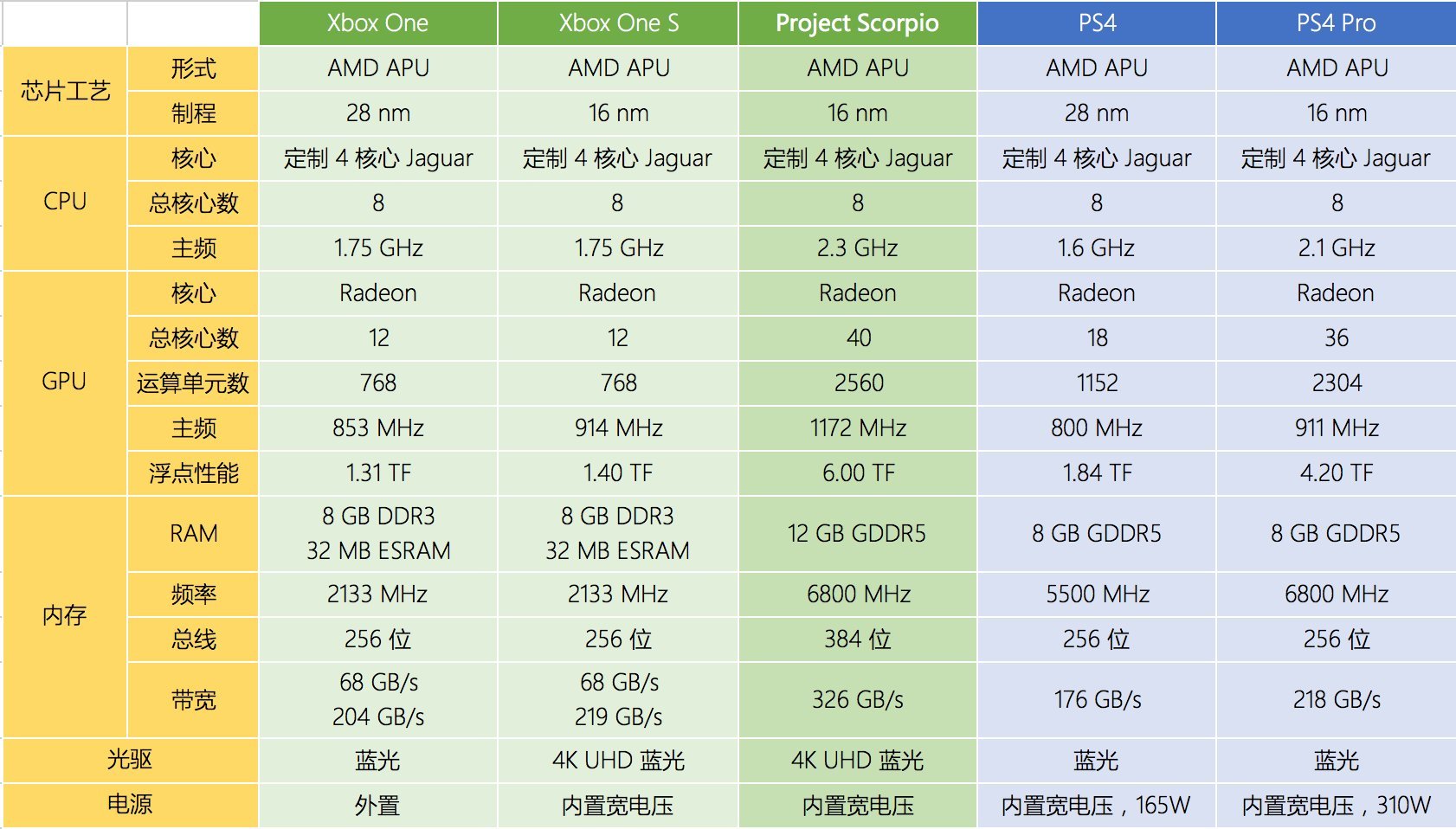 Xbox One X同其他索尼系/微软系第八世代主机性能参数对比