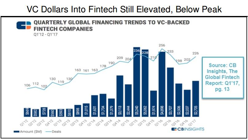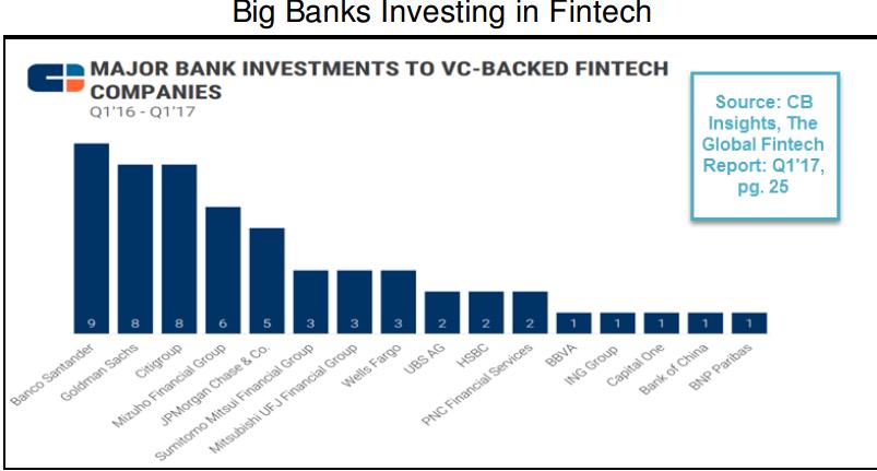 1、风投资金流入金融科技行业的速度放慢、银行与支付公司加速前进