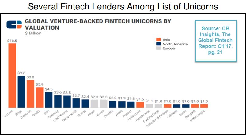 4月份,Elevate Credit和中国信而富上市,市场反应有点冷淡,私人金融科技公司可能要等更长的时间才会IPO。Elevate Credit和中国信而富的发行价低于目标价,自上市之后价格持平。另外,Lending Club和On Deck Capital的股价表现不好,尽管如此,仍然有7家金融科技借贷公司的估值超过10亿美元,最高的是陆金所,然后是学生贷款公司SoFi(45亿美元)、消费金融平台GreenSky(36亿美元)。