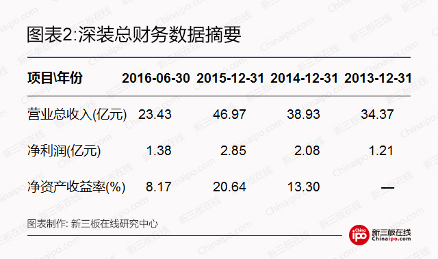 如果与新三板的同行业公司比较,深装总则常年保持领跑的地位,例如2015年全年营收46.97亿元位居行业第一,而云南路桥和维泰股份分别以28.75亿元和24.47亿元的营收排名第二、三位。此外,深装总的净利润也以2.85亿元排名行业第一。