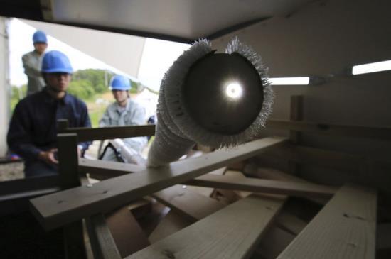 当地时间2017年6月12日,日本宫城县仙台市,日本东北大学研究员展示的蛇形机器人。据日本共同社报道,日本东北大学等组成的团队开发出一款蛇形机器人,可通过喷射空气抬高配备摄像头的前端部分,穿越较高障碍物在废墟内部展开搜索。12日向媒体亮相的该机器人能在调查受灾时倒塌受损的建筑物内部时轻松把握状况,因有利于抢救生命而备受期待,团队将力争3年后投入实际应用。