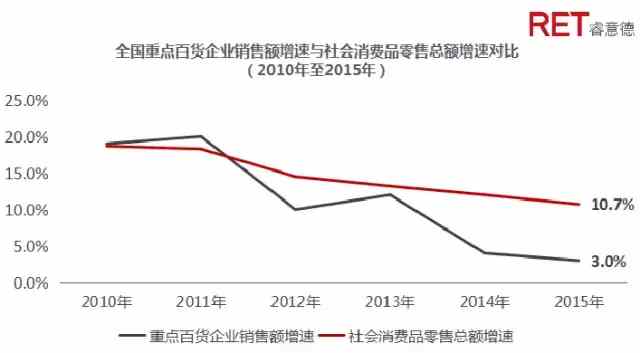 2015年中国重点百货企业销售额增速已经下降至3.4%的近6年来最低水平。2012年第一次下跌,全国至少关店449家。