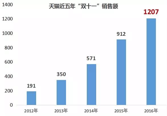 2016年,双十一天猫总交易额超1207亿元,交易额超过2012年交易额六倍之多: