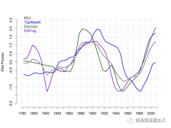 上图显示的是Turchin根据一系列指标编制的美国“精英指数”(上图红线)和“平民福利指数”(上图绿线)。“精英指数”由一系列指标组成,比如大学学费,贫富差距,政治分化程度等。就是说,一个社会如果高等教育学费越贵,贫富差距和政治观点差距越大,那么该社会的“精英指数”也就越高。