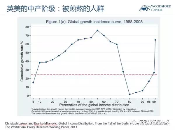 上图显示的是世界银行的两位经济学家做过的一个全球经济增长分析(Lakner and Milanovic, 2013)。图中显示的是在世界范围中,不同的收入群体(从低到高,从左到右)在1988-2008年间的收入增长。平均来讲,全世界在这20年间的收入增加了25%左右。但是绝大部分的财富增长,都被发展中国家本来收入比较低的人群(以中国为代表的新兴经济群体)享受,而发达国家的工薪和中产阶层(上图85%-99%的收入人群),其财富增长远低于世界平均,甚至接近0(就是说20年前和现在没啥区别)。而那些收入在全世界最高的1%的群体,他们的财富增长并没有受到影响,其增长的幅度大约为70%左右,接近全世界最高水平。