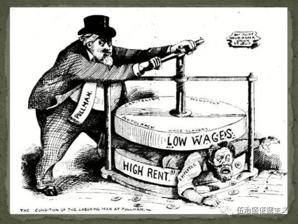 在美国历史上,1880-1910年大致处于一个非常特殊的年代,叫做“镀金时代(Gilded age)”。该名称来自于马克·吐温和查·华纳合写的一本同名小说《镀金时代》。该小说通过对一位企业家兼政客的描写,揭露了西部投机家、东部企业家和政府官吏三位一体掠夺国家和人民财富的黑幕。比如上面这副漫画,描绘的就是“镀金时代”时期资本家通过低工资和高房租双重压榨工人的社会现实。