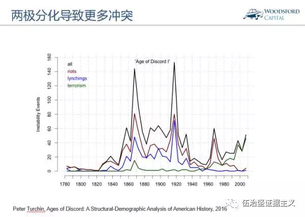上图显示的是Peter Turchin基于美国历史统计的冲突数量。这些冲突包括恐怖袭击,骚乱和私刑。我们可以看到,当历史上的“精英”和“草根”开始脱节,人民内部阶级矛盾激化的时候,这些冲突的数量也会快速上升。笔者在上文中提到的“镀金年代”,恰恰也是这些冲突数量最多的时候。