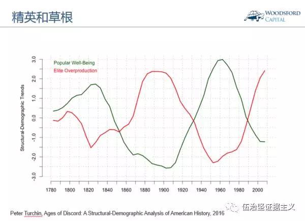 在美国学者Peter Turchin写的Ages of Discord: A Structural-Demographic Analysis of American History一书中,作者统计了美国很多经济和社会学方面的指标,得出结论:美国社会正在向一个错误的方向前进。Turchin将这个不好的现象称为“精英过度”(Elite overproduction)。