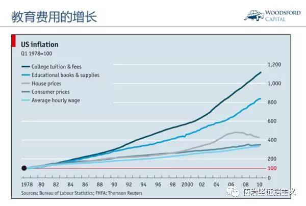 比如上图显示,美国高等教育的费用(上图深蓝线)在过去30年间上涨了11倍,而同期的工人工资只上涨了不到3倍,全国平均房价也只是上涨了3倍左右。如果一个工薪阶层的孩子连大学都上不起,还谈什么出人头地,改变命运?