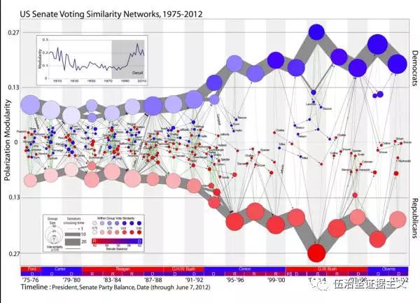 这些分歧和争端在政治上的表现形式就是政党极端化(Political polarization)。从上图中我们可以看到,美国两党之间的分歧(蓝色为民主党,红色为共和党),是过去40年以来最大的。很多时候,政治变成了一场简单的站队游戏。在讨论任何问题之前,参与者首先要明确的是自己属于哪一派别。在这种“派系政治”下,很难能够听到理性的中立意见,很多实际问题也因此而被拖延搁置。